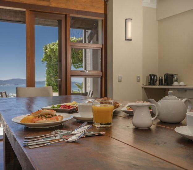 The luxurious villa is comprised of five king suites, each with its own unique appeal. Each charming suite has its own private en suite and three of the suites can be reconfigured into twin single arrangements. Each room has complimentary Wi-Fi and tea and coffee-making facilities, and gorgeous private outdoor space overlooking the countryside and the bay.