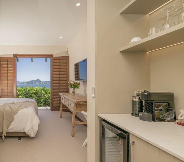 Mercury Ridge’s two lodge rooms enjoy unobstructed views of the sparkling waters of Mercury Bay with spacious and comfortable super king or twin beds.